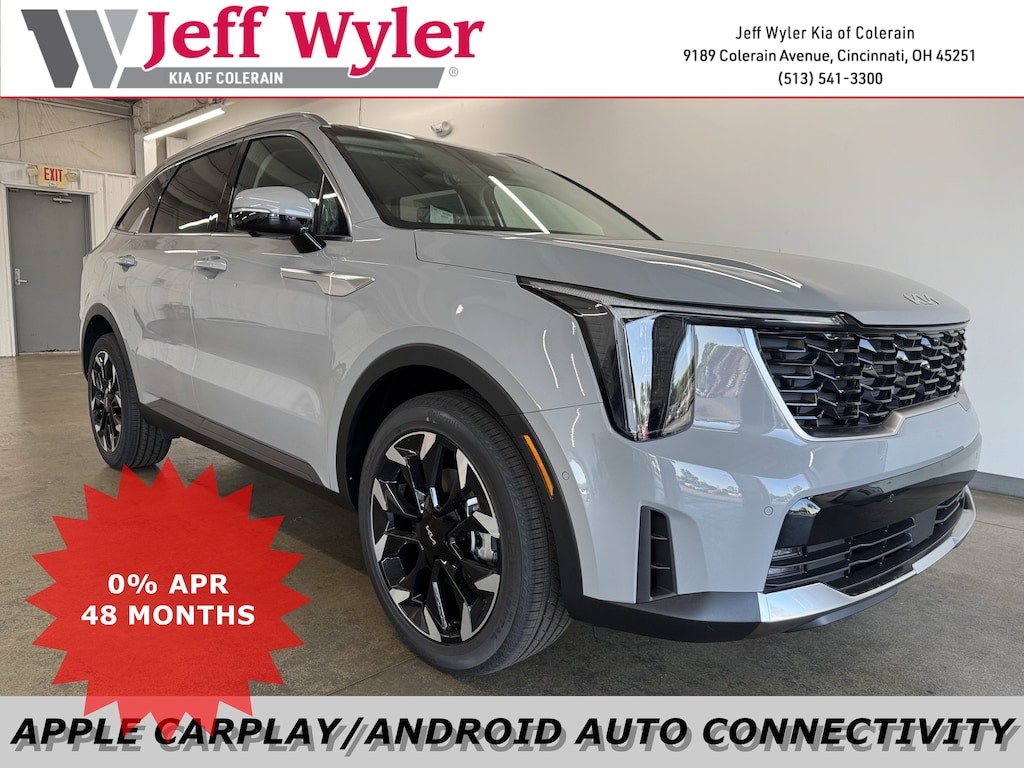 Jeff Wyler Kia of Colerain is excited to offer this good-looking 2025 Kia Sorento SX in Wolf Gray. 3rd row seats: split-bench, 4-Wheel Disc Brakes, 6 Speakers, ABS brakes, Air Conditioning, Alloy wheels, AM/FM radio: SiriusXM, Apple CarPlay & Android Auto, Auto High-beam Headlights, Auto-dimming Rear-View mirror, Automatic temperature control, Brake assist, Bumpers: body-color, Carpeted Floor Mats, Delay-off headlights, Driver door bin, Driver vanity mirror, Dual front impact airbags, Dual front side impact airbags, Electronic Stability Control, Emergency communication system: 911 Connect, Exterior Parking Camera Rear, Four wheel independent suspension, Front anti-roll bar, Front Bucket Seats, Front Center Armrest, Front dual zone A/C, Front fog lights, Front reading lights, Fully automatic headlights, Heated & Ventilated Front Bucket Seats, Heated door mirrors, Heated front seats, Illuminated entry, Knee airbag, Leather Shift Knob, Leather steering wheel, Low tire pressure warning, Navigation System, Occupant sensing airbag, Outside temperature display, Overhead airbag, Overhead console, Panic alarm, Passenger door bin, Passenger vanity mirror, Power door mirrors, Power driver seat, Power Liftgate, Power moonroof, Power passenger seat, Power steering, Power windows, Radio data system, Radio: AM/FM Standard Sound System, Rain sensing wipers, Rear anti-roll bar, Rear reading lights, Rear side impact airbag, Rear window defroster, Rear window wiper, Remote keyless entry, Security system, Speed control, Speed-sensing steering, Split folding rear seat, Spoiler, Steering wheel mounted audio controls, SynTex Artificial Leather Seat Trim, Tachometer, Telescoping steering wheel, Tilt steering wheel, Traction control, Trip computer, Turn signal indicator mirrors, Variably intermittent wipers, Ventilated front seats, and Wheels: 20" Machine-Finished Gloss Black Alloy Our PRE-OWNED vehicles are put through a rigorous 167- POINT QUALITY ASSURANCE INSPECTION along with an average amount of over $1,400.00 SPENT to recondition each vehicle so we can be sure to deliver you the highest quality vehicle like you deserve! ***ONLINE PRICE DOES NOT INCLUDE WYLER FAMILY FIRST PACKAGE***