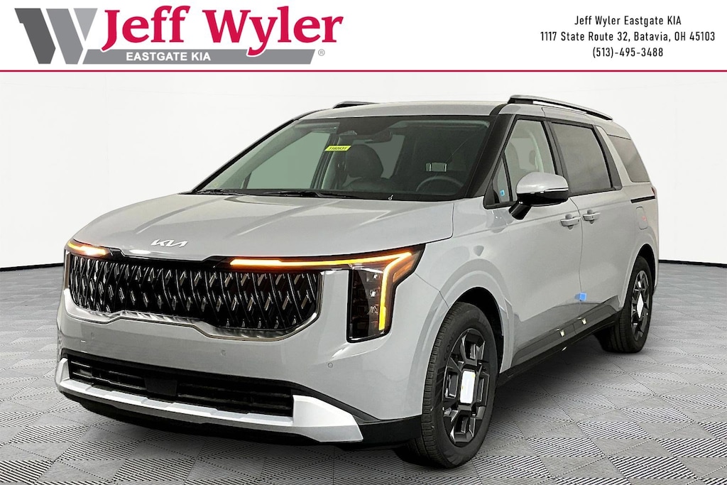 Ceramic Silver 2026 Kia Carnival Hybrid EX 1.6L I4 DGI Hybrid Turbocharged DOHC 16V LEV3-SULEV30 FWD 6-Speed Automatic 34/31 City/Highway MPG Jeff Wyler Eastgate Auto Mall is excited to offer this fantastic-looking 2026 Kia Carnival Hybrid EX in Ceramic Silver. Well equipped with: 3rd row seats: split-bench, 4-Wheel Disc Brakes, 8 Speakers, ABS brakes, Air Conditioning, All Weather Floor Mats (8-Passenger), Alloy wheels, AM/FM radio: SiriusXM, Apple CarPlay & Android Auto, Artificial Leather Seat Trim, Auto High-beam Headlights, Auto-Dimming Mirror with HomeLink, Automatic temperature control, Brake assist, Bumpers: body-color, Compass, Delay-off headlights, Driver door bin, Driver vanity mirror, Dual front impact airbags, Dual front side impact airbags, Electronic Stability Control, Emergency communication system, Exterior Parking Camera Rear, Four wheel independent suspension, Front anti-roll bar, Front Bucket Seats, Front Center Armrest, Front dual zone A/C, Front reading lights, Fully automatic headlights, Heated door mirrors, Heated Front Bucket Seats, Heated front seats, Illuminated entry, Knee airbag, Leather Shift Knob, Leather steering wheel, Low tire pressure warning, Memory seat, Navigation System, Occupant sensing airbag, Outside temperature display, Overhead airbag, Overhead console, Panic alarm, Passenger door bin, Passenger vanity mirror, Power door mirrors, Power driver seat, Power Liftgate, Power passenger seat, Power steering, Power windows, Radio: : Navigation System with SiriusXM, Rear air conditioning, Rear anti-roll bar, Rear reading lights, Rear window defroster, Rear window wiper, Reclining 3rd row seat, Remote keyless entry, Security system, Speed control, Speed-sensing steering, Split folding rear seat, Spoiler, Steering wheel mounted audio controls, Tachometer, Telescoping steering wheel, Tilt steering wheel, Traction control, Trip computer, Turn signal indicator mirrors, Variably intermittent wipers, and Wheels: 19" Black Alloy. 34/31 City/Highway MPG