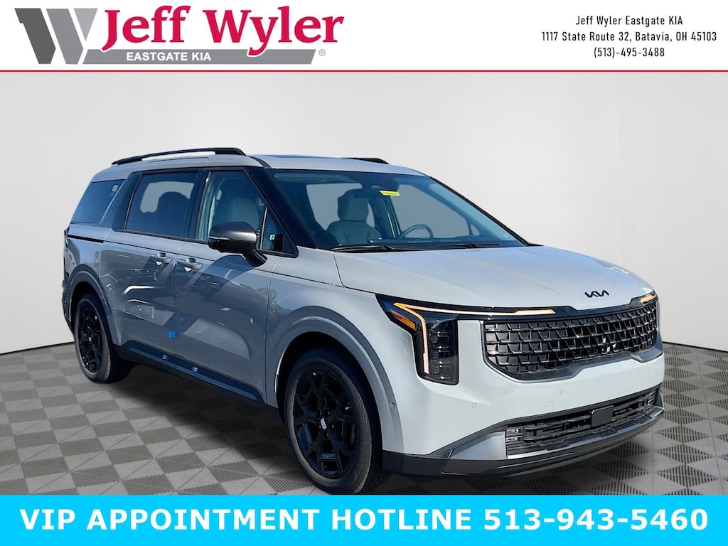 Ceramic Silver 2026 Kia Carnival Hybrid SX Prestige 1.6L I4 DGI Hybrid Turbocharged DOHC 16V LEV3-SULEV30 FWD 6-Speed Automatic 34/31 City/Highway MPG Jeff Wyler Eastgate Auto Mall is pumped up to offer this terrific-looking 2026 Kia Carnival Hybrid SX Prestige in Ceramic Silver. Well equipped with: 3rd row seats: split-bench, 4-Wheel Disc Brakes, ABS brakes, Air Conditioning, All Weather Floor Mats (8-Passenger), Alloy wheels, AM/FM radio: SiriusXM, Apple CarPlay & Android Auto, Auto High-beam Headlights, Automatic temperature control, Brake assist, Bumpers: body-color, Compass, Delay-off headlights, Driver door bin, Driver vanity mirror, Dual front impact airbags, Dual front side impact airbags, Electronic Stability Control, Emergency communication system, Exterior Parking Camera Rear, Four wheel independent suspension, Front anti-roll bar, Front Bucket Seats, Front Center Armrest, Front dual zone A/C, Front fog lights, Front reading lights, Fully automatic headlights, Heated and Ventilated Front Bucket Seats, Heated door mirrors, Heated front seats, Illuminated entry, Knee airbag, Leather Shift Knob, Leather steering wheel, Low tire pressure warning, Memory seat, Navigation System, Occupant sensing airbag, Outside temperature display, Overhead airbag, Overhead console, Panic alarm, Passenger door bin, Passenger vanity mirror, Power 2nd-Row Moonroof, Power door mirrors, Power driver seat, Power Liftgate, Power moonroof, Power passenger seat, Power steering, Power windows, Radio: : Navigation System with SiriusXM, Rain sensing wipers, Rear air conditioning, Rear anti-roll bar, Rear reading lights, Rear window defroster, Rear window wiper, Reclining 3rd row seat, Remote keyless entry, Security system, Speed control, Speed-sensing steering, Split folding rear seat, Spoiler, Steering wheel mounted audio controls, Tachometer, Telescoping steering wheel, Tilt steering wheel, Traction control, Trip computer, Turn signal indicator mirrors, Variably intermittent wipers, Ventilated front seats, and Wheels: 19" Black D-Cut Customizing. 34/31 City/Highway MPG