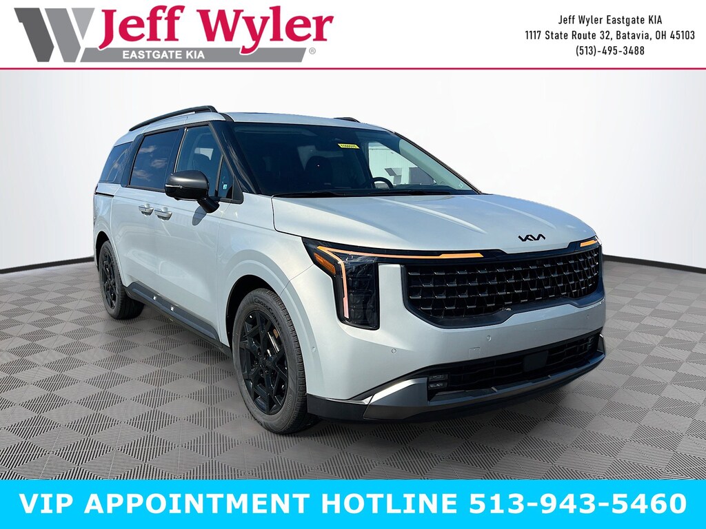 Ivory Silver 2026 Kia Carnival Hybrid SX Prestige 1.6L I4 DGI Hybrid Turbocharged DOHC 16V LEV3-SULEV30 FWD 6-Speed Automatic 34/31 City/Highway MPG Jeff Wyler Eastgate Auto Mall is pumped up to offer this attractive 2026 Kia Carnival Hybrid SX Prestige in Ivory Silver. Well equipped with: Rear Seat Entertainment Package (Dual Screen Rear Seat Entertainment System), SX Prestige Seat Package (2nd Row Laminated Windows, Ambient Lighting, Heated/Ventilated 2nd Row Power Vip Lounge Seats, and High Glossy Interior Trim), 12 Speakers, 3rd row seats: split-bench, 4-Wheel Disc Brakes, ABS brakes, Air Conditioning, Alloy wheels, AM/FM radio: SiriusXM, Apple CarPlay & Android Auto, Auto High-beam Headlights, Auto-dimming Rear-View mirror, Automatic temperature control, Brake assist, Bumpers: body-color, Compass, Delay-off headlights, Driver door bin, Driver vanity mirror, Dual front impact airbags, Dual front side impact airbags, Electronic Stability Control, Emergency communication system, Exterior Parking Camera Rear, Four wheel independent suspension, Front anti-roll bar, Front Bucket Seats, Front Center Armrest, Front dual zone A/C, Front fog lights, Front reading lights, Fully automatic headlights, Garage door transmitter: HomeLink, Heads-Up Display, Heated and Ventilated Front Bucket Seats, Heated door mirrors, Heated front seats, Heated steering wheel, Illuminated entry, Knee airbag, Leather Seat Trim, Leather Shift Knob, Leather steering wheel, Low tire pressure warning, Luxury Carpeted Floor Mats, Memory seat, Navigation System, Occupant sensing airbag, Outside temperature display, Overhead airbag, Overhead console, Panic alarm, Passenger door bin, Passenger vanity mirror, Power 2nd-Row Moonroof, Power door mirrors, Power driver seat, Power Liftgate, Power moonroof, Power passenger seat, Power steering, Power windows, Radio: : Navigation System with SiriusXM, Rain sensing wipers, Rear air conditioning, Rear anti-roll bar, Rear reading lights, Rear window defroster, Rear window wiper, Reclining 3rd row seat, Remote keyless entry, Security system, Speed control, Speed-sensing steering, Split folding rear seat, Spoiler, Steering wheel mounted audio controls, Tachometer, Telescoping steering wheel, Tilt steering wheel, Traction control, Trip computer, Turn signal indicator mirrors, Variably intermittent wipers, Ventilated front seats, Wheel Locks, and Wheels: 19" Black D-Cut Customizing. 34/31 City/Highway MPG