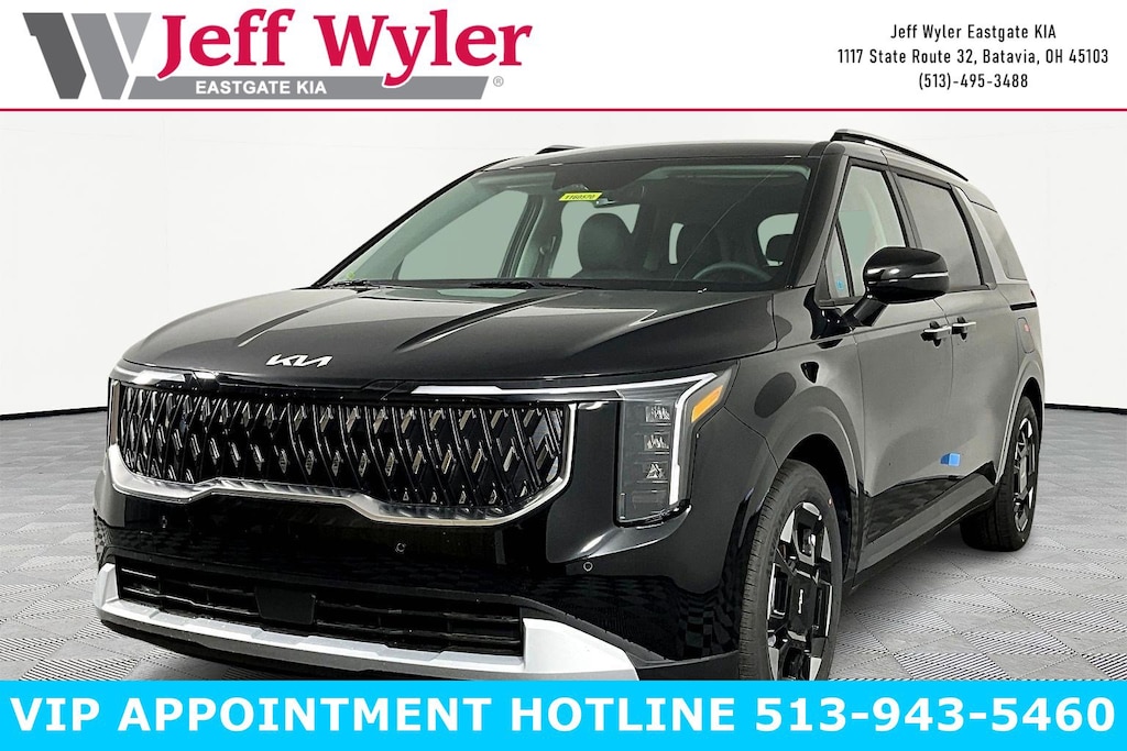 Aurora Black Pearl 2026 Kia Carnival EX V6 FWD 8-Speed Automatic 18/26 City/Highway MPG Jeff Wyler Eastgate Auto Mall is excited to offer this great 2026 Kia Carnival EX in Aurora Black Pearl. Well equipped with: 3.51 Axle Ratio, 3rd row seats: split-bench, 4-Wheel Disc Brakes, 8 Speakers, ABS brakes, Air Conditioning, All Weather Floor Mats (8-Passenger), Alloy wheels, AM/FM radio: SiriusXM, Apple CarPlay & Android Auto, Artificial Leather Seat Trim, Auto High-beam Headlights, Auto-Dimming Mirror with HomeLink, Automatic temperature control, Brake assist, Bumpers: body-color, Compass, Delay-off headlights, Driver door bin, Driver vanity mirror, Dual front impact airbags, Dual front side impact airbags, Electronic Stability Control, Emergency communication system, Exterior Parking Camera Rear, Four wheel independent suspension, Front anti-roll bar, Front Bucket Seats, Front Center Armrest, Front dual zone A/C, Front reading lights, Fully automatic headlights, Heated door mirrors, Heated Front Bucket Seats, Heated front seats, Illuminated entry, Knee airbag, Leather Shift Knob, Leather steering wheel, Low tire pressure warning, Memory seat, Navigation System, Occupant sensing airbag, Outside temperature display, Overhead airbag, Overhead console, Panic alarm, Passenger door bin, Passenger vanity mirror, Power door mirrors, Power driver seat, Power Liftgate, Power passenger seat, Power steering, Power windows, Radio: AM/FM/HD Audio System, Rear air conditioning, Rear anti-roll bar, Rear reading lights, Rear window defroster, Rear window wiper, Reclining 3rd row seat, Remote keyless entry, Security system, Speed control, Speed-sensing steering, Split folding rear seat, Spoiler, Steering wheel mounted audio controls, Tachometer, Telescoping steering wheel, Tilt steering wheel, Traction control, Trip computer, Turn signal indicator mirrors, Variably intermittent wipers, and Wheels: 7.5J x 19" Machine-Finished Alloy. 18/26 City/Highway MPG