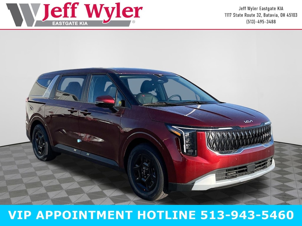 Flare Red 2026 Kia Carnival LXS V6 FWD 8-Speed Automatic 18/26 City/Highway MPG Jeff Wyler Eastgate Auto Mall is pumped up to offer this fantastic 2026 Kia Carnival LXS in Flare Red. Well equipped with: 3.51 Axle Ratio, 3rd row seats: split-bench, 4-Wheel Disc Brakes, 6 Speakers, 6.5J x 17" Alloy Wheels, ABS brakes, Air Conditioning, Alloy wheels, AM/FM radio: SiriusXM, Apple CarPlay & Android Auto, Artificial Leather Seat Trim, Auto High-beam Headlights, Automatic temperature control, Brake assist, Bumpers: body-color, Cargo Net, Cargo Tray, Carpeted Floor Mats (8-Passenger), Compass, Delay-off headlights, Driver door bin, Driver vanity mirror, Dual front impact airbags, Dual front side impact airbags, Electronic Stability Control, Emergency communication system, Exterior Parking Camera Rear, Four wheel independent suspension, Front anti-roll bar, Front Bucket Seats, Front Center Armrest, Front dual zone A/C, Front reading lights, Fully automatic headlights, Heated door mirrors, Heated Front Bucket Seats, Heated front seats, Illuminated entry, Knee airbag, Leather Shift Knob, Leather steering wheel, Low tire pressure warning, Navigation System, Occupant sensing airbag, Outside temperature display, Overhead airbag, Overhead console, Panic alarm, Passenger door bin, Passenger vanity mirror, Power door mirrors, Power driver seat, Power steering, Power windows, Radio: AM/FM/HD Audio System, Rear air conditioning, Rear anti-roll bar, Rear reading lights, Rear window defroster, Rear window wiper, Reclining 3rd row seat, Remote keyless entry, Security system, Speed control, Speed-sensing steering, Split folding rear seat, Spoiler, Steering wheel mounted audio controls, Tachometer, Telescoping steering wheel, Tilt steering wheel, Traction control, Trip computer, Turn signal indicator mirrors, and Variably intermittent wipers. 18/26 City/Highway MPG