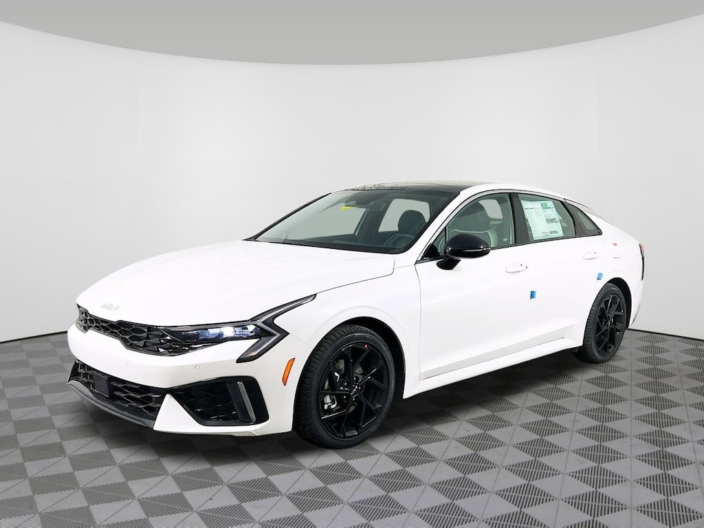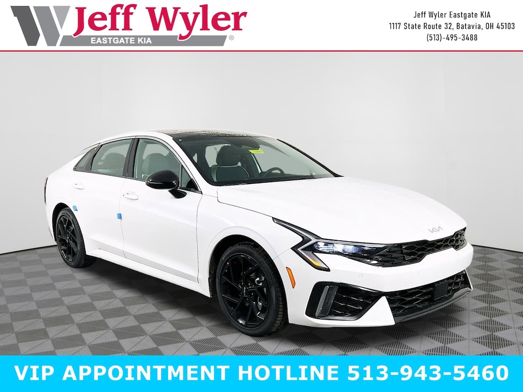 Snow White Pearl 2026 Kia K5 GT-Line I4 AWD 8-Speed Automatic 24/33 City/Highway MPG Jeff Wyler Eastgate Auto Mall is delighted to offer this handsome 2026 Kia K5 GT-Line in Snow White Pearl. Well equipped with: GT-Line Premium Package (Active Sound Design, Bose Premium Audio, LED Interior Lighting, Panoramic Sunroof, and Wheels: 18" x 7.5J Unique Gloss Black Alloy), 4-Wheel Disc Brakes, 6 Speakers, ABS brakes, Air Conditioning, Alloy wheels, AM/FM radio: SiriusXM, Apple CarPlay & Android Auto, Auto High-beam Headlights, Auto-Dimming Mirror with HomeLink, Automatic temperature control, Brake assist, Bumpers: body-color, Delay-off headlights, Driver door bin, Driver vanity mirror, Dual front impact airbags, Dual front side impact airbags, Electronic Stability Control, Emergency communication system: Kia Connect (includes 1 year free trial), Four wheel independent suspension, Front anti-roll bar, Front Bucket Seats, Front Center Armrest, Front dual zone A/C, Front fog lights, Front reading lights, Fully automatic headlights, Heated door mirrors, Heated Front Bucket Seats, Heated front seats, Heated steering wheel, Illuminated entry, Knee airbag, Leather Shift Knob, Leather steering wheel, Low tire pressure warning, Navigation System, Occupant sensing airbag, Outside temperature display, Overhead airbag, Overhead console, Panic alarm, Passenger door bin, Passenger vanity mirror, Power door mirrors, Power driver seat, Power steering, Power windows, Radio data system, Radio: AM/FM Audio System, Rear anti-roll bar, Rear seat center armrest, Rear side impact airbag, Rear window defroster, Remote keyless entry, Security system, Speed control, Speed-sensing steering, Split folding rear seat, Sport steering wheel, Steering wheel mounted audio controls, Tachometer, Telescoping steering wheel, Tilt steering wheel, Traction control, Trip computer, Turn signal indicator mirrors, Variably intermittent wipers, and Wheels: 18" x 7.5J Gloss Black Machined Finish Alloy. 24/33 City/Highway MPG