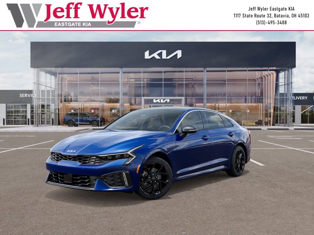 Blue 2026 Kia K5 GT-Line I4 AWD 8-Speed Automatic 24/33 City/Highway MPG Jeff Wyler Eastgate Auto Mall is delighted to offer this terrific 2026 Kia K5 GT-Line in Blue. Well equipped with: GT-Line Premium Package (Active Sound Design, Bose Premium Audio, LED Interior Lighting, Panoramic Sunroof, and Wheels: 18" x 7.5J Unique Gloss Black Alloy), 4-Wheel Disc Brakes, 6 Speakers, ABS brakes, Air Conditioning, Alloy wheels, AM/FM radio: SiriusXM, Apple CarPlay & Android Auto, Auto High-beam Headlights, Auto-Dimming Mirror with HomeLink, Automatic temperature control, Brake assist, Bumpers: body-color, Delay-off headlights, Driver door bin, Driver vanity mirror, Dual front impact airbags, Dual front side impact airbags, Electronic Stability Control, Emergency communication system: Kia Connect (includes 1 year free trial), Four wheel independent suspension, Front anti-roll bar, Front Bucket Seats, Front Center Armrest, Front dual zone A/C, Front fog lights, Front reading lights, Fully automatic headlights, Heated door mirrors, Heated Front Bucket Seats, Heated front seats, Heated steering wheel, Illuminated entry, Knee airbag, Leather Shift Knob, Leather steering wheel, Low tire pressure warning, Navigation System, Occupant sensing airbag, Outside temperature display, Overhead airbag, Overhead console, Panic alarm, Passenger door bin, Passenger vanity mirror, Power door mirrors, Power driver seat, Power steering, Power windows, Radio data system, Radio: AM/FM Audio System, Rear anti-roll bar, Rear seat center armrest, Rear side impact airbag, Rear window defroster, Remote keyless entry, Security system, Speed control, Speed-sensing steering, Split folding rear seat, Sport steering wheel, Steering wheel mounted audio controls, Tachometer, Telescoping steering wheel, Tilt steering wheel, Traction control, Trip computer, Turn signal indicator mirrors, Variably intermittent wipers, and Wheels: 18" x 7.5J Gloss Black Machined Finish Alloy. 24/33 City/Highway MPG