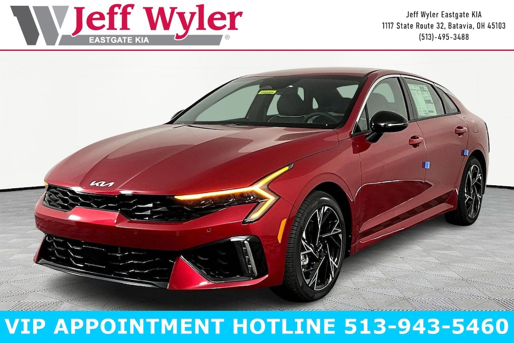 Runway Red 2026 Kia K5 GT-Line I4 FWD 8-Speed Automatic 25/36 City/Highway MPG Jeff Wyler Eastgate Auto Mall is proud to offer this good-looking 2026 Kia K5 GT-Line in Runway Red. Well equipped with: GT-Line Premium Package (Active Sound Design, Bose Premium Audio, LED Interior Lighting, Panoramic Sunroof, and Wheels: 18" x 7.5J Unique Gloss Black Alloy), 4-Wheel Disc Brakes, 6 Speakers, ABS brakes, Air Conditioning, Alloy wheels, AM/FM radio: SiriusXM, Auto High-beam Headlights, Auto-Dimming Mirror with HomeLink, Automatic temperature control, Brake assist, Bumpers: body-color, Delay-off headlights, Driver door bin, Driver vanity mirror, Dual front impact airbags, Dual front side impact airbags, Electronic Stability Control, Emergency communication system: Kia Connect (includes 1 year free trial), Four wheel independent suspension, Front anti-roll bar, Front Bucket Seats, Front Center Armrest, Front dual zone A/C, Front fog lights, Front reading lights, Fully automatic headlights, Heated door mirrors, Heated Front Bucket Seats, Heated front seats, Illuminated entry, Knee airbag, Leather Shift Knob, Leather steering wheel, Low tire pressure warning, Navigation System, Occupant sensing airbag, Outside temperature display, Overhead airbag, Overhead console, Panic alarm, Passenger door bin, Passenger vanity mirror, Power door mirrors, Power driver seat, Power steering, Power windows, Radio data system, Radio: AM/FM Audio System, Rear anti-roll bar, Rear seat center armrest, Rear side impact airbag, Rear window defroster, Remote keyless entry, Security system, Speed control, Speed-sensing steering, Split folding rear seat, Sport steering wheel, Steering wheel mounted audio controls, Tachometer, Telescoping steering wheel, Tilt steering wheel, Traction control, Trip computer, Turn signal indicator mirrors, Variably intermittent wipers, and Wheels: 18" x 7.5J Gloss Black Machined Finish Alloy. 25/36 City/Highway MPG