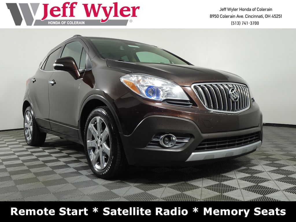 Jeff Wyler Honda of Colerain is pumped up to offer this fantastic 2016 Buick Encore Leather in Deep Espresso Brown Metallic. Well equipped with: Experience Buick Package (18" 7-Spoke Chromed Aluminum Wheels, Power Tilt-Sliding Moonroof, Radio: AM/FM Audio System w/Nav/Single CD Player, and SiriusXM Satellite Radio), Preferred Equipment Group 1SL, 3.53 Final Drive Axle Ratio, 4-Wheel Disc Brakes, 6 Speakers, 6-Way Power Driver Seat Adjuster, 6-Way Power Front Passenger Seat Adjuster, ABS brakes, Air Conditioning, Alloy wheels, AM/FM radio: SiriusXM, Auto-dimming Rear-View mirror, Automatic temperature control, Brake assist, Bumpers: body-color, Cargo Net, CD player, Color-Keyed Carpeted Cargo Mat (LPO), Compass, Delay-off headlights, Driver door bin, Driver vanity mirror, Driver's Seat Mounted Armrest, Dual front impact airbags, Dual front side impact airbags, Electronic Stability Control, Emergency communication system: OnStar Guidance, Exterior Parking Camera Rear, Front anti-roll bar, Front Bucket Seats, Front dual zone A/C, Front fog lights, Front License Plate Bracket, Front reading lights, Front wheel independent suspension, Fully automatic headlights, Heated door mirrors, Heated Driver & Front Passenger Seats, Heated front seats, Heated steering wheel, Illuminated entry, Knee airbag, Leather steering wheel, Leather-Appointed Seat Trim, Low tire pressure warning, Memory seat, Occupant sensing airbag, Outside temperature display, Overhead airbag, Panic alarm, Passenger door bin, Passenger vanity mirror, Power door mirrors, Power driver seat, Power passenger seat, Power steering, Power windows, Premium audio system: IntelliLink, Radio data system, Radio: AM/FM Audio System w/MP3 CD Player, Rear seat center armrest, Rear side impact airbag, Rear window defroster, Rear window wiper, Remote keyless entry, Ride & Handling Suspension, Roof rack: rails only, Security system, Speed control, Speed-sensing steering, Split folding rear seat, Spoiler, Steering wheel mounted audio controls, Tachometer, Telescoping steering wheel, Tilt steering wheel, Traction control, Trip computer, Turn signal indicator mirrors, Variably intermittent wipers, and Wheels: 18" 5-Spoke Cast Aluminum.