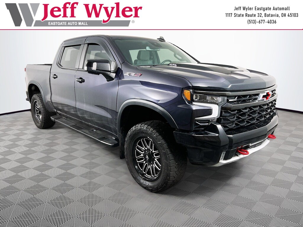 Jeff Wyler Eastgate Auto Mall is proud to offer this outstanding-looking 2023 Chevrolet Silverado 1500 ZR2 in Dark Ash Metallic. Well equipped with: Preferred Equipment Group 3LT (10-Way Power Driver Seat w/Lumbar, 10-Way Power Passenger Seat Adjuster w/Lumbar, 12.3" Multicolor Reconfigurable Digital Display, 120-Volt Bed Mounted Power Outlet, 120-Volt Instrument Panel Power Outlet, 170 Amp Alternator, 2 USB Data Ports, 2nd Row Heated Outboard Seats, All-Weather Floor Liner (LPO), Auto-Dimming Inside Rear-View Mirror, Auto-Locking Rear Differential, Bed View Camera, Bluetooth® For Phone, Chevrolet Connected Access Capable, Chevytec Spray-On Black Bedliner, Color-Keyed Carpeting Floor Covering, Compass, Deep-Tinted Glass, Driver Memory, Dual Exhaust, Dual Rear USB Ports (Charge Only), Electric Rear-Window Defogger, Electrical Steering Column Lock, Electronic Cruise Control, EZ Lift Power Lock & Release Tailgate, Floor Mounted Center Console, Front LED Fog Lamps, Front Rainsensing Wipers, HD Surround Vision, Heated Driver & Front Outboard Passenger Seats, Heated Steering Wheel, Heavy-Duty Air Filter, High Gloss Black Mirror Caps, Hill Descent Control, Hitch Guidance w/Hitch View, Integrated Trailer Brake Controller, Keyless Open & Start, LED Cargo Area Lighting, Manual Tilt/Telescoping Steering Column, OnStar & Chevrolet Connected Services Capable, Outside Heated Power-Adjustable Mirrors, Performance Red Recovery Hooks, Perimeter Lighting, Power Front Passenger Windows w/Express Up/Down, Power Front Windows w/Driver Express Up/Down, Power Rear Windows w/Express Down, Power Sliding Rear Window w/Rear Defogger, Rear Cross Traffic Alert-Braking, Rear Park Assist, Rear Pedestrian Alert, Rear Wheelhouse Liners, Remote Vehicle Starter System, Safety Alert Seat, SiriusXM w/360L, Standard Tailgate, Steering Wheel Audio Controls, Theft Deterrent System (Unauthorized Entry), Trailer Camera Provisions, Trailer Side Blind Zone Alert, Trailering App, Universal Home Remote, Ventilated Driver & Front Passenger Seats, Wi-Fi Hot Spot Capable, Wireless Charging, Wireless Phone Projection, and Wrapped Steering Wheel), Trailering Package (Hitch Guidance), Up-Level Rear Seat w/Storage Package, ZR2 Suspension Package, 3.23 Rear Axle Ratio, 4-Wheel Disc Brakes, 6" Rectangular Black Tubular Assist Steps (LPO), 7 Speakers, ABS brakes, Air Conditioning, Alloy wheels, AM/FM radio: SiriusXM with 360L, Apple CarPlay/Android Auto, Auto High-beam Headlights, Auto-dimming door mirrors, Auto-dimming Rear-View mirror, Automatic Emergency Braking, Automatic temperature control, Brake assist, Delay-off headlights, Driver door bin, Driver vanity mirror, Dual front impact airbags, Dual front side impact airbags, Electronic Stability Control, Electronic Transmission Range Selector Shifter, Following Distance Indicator, Forward Collision Alert, Front anti-roll bar, Front Bucket Seats, Front Center Armrest, Front dual zone A/C, Front fog lights, Front License Plate Kit, Front Pedestrian Braking, Front reading lights, Front wheel independent suspension, Fully automatic headlights, Garage door transmitter, Heated door mirrors, Heated front seats, Heated rear seats, Heated steering wheel, Illuminated entry, IntelliBeam Automatic High Beam On/Off, Lane Keep Assist w/Lane Departure Warning, Low tire pressure warning, Memory seat, Not Equipped w/Steering Column Lock, Occupant sensing airbag, Outside temperature display, Overhead airbag, Overhead console, Panic alarm, Passenger door bin, Passenger vanity mirror, Perforated Leather Seat Trim, Power door mirrors, Power driver seat, Power passenger seat, Power steering, Power windows, Premium audio system: Chevrolet Infotainment 3 Premium, Premium Bose 7-Speaker Sound System, Radio data system, Radio: Chevrolet Infotainment 3 Premium System, Rain sensing wipers, Rear Parking Sensors, Rear reading lights, Rear seat center armrest, Rear step bumper, Rear window defroster, Remote keyless entry, Security system, Speed control, Spee