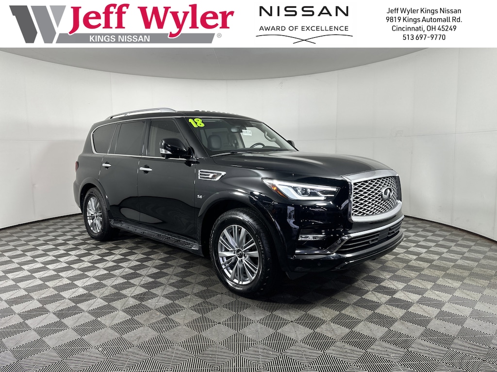 Jeff Wyler Kings Nissan is honored to offer this gorgeous 2018 INFINITI QX80 in Black Obsidian. Well equipped with: 13 Speakers, 2.94 Axle Ratio, 3rd row seats: split-bench, 4-Wheel Disc Brakes, ABS brakes, Activation Disclaimer, Air Conditioning, Alloy wheels, AM/FM radio: SiriusXM, Anti-whiplash front head restraints, Auto High-beam Headlights, Auto tilt-away steering wheel, Auto-dimming door mirrors, Auto-dimming Rear-View mirror, Auto-leveling suspension, Automatic temperature control, Brake assist, Bumpers: body-color, CD player, Delay-off headlights, Driver door bin, Driver vanity mirror, Dual front impact airbags, Dual front side impact airbags, Electronic Stability Control, Emergency communication system: INFINITI Connection, Four wheel independent suspension, Front anti-roll bar, Front Bucket Seats, Front Center Armrest, Front dual zone A/C, Front fog lights, Front reading lights, Fully automatic headlights, Garage door transmitter: HomeLink, Genuine wood console insert, Genuine wood dashboard insert, Genuine wood door panel insert, Heated door mirrors, Heated Front Bucket Seats, Heated front seats, Heated steering wheel, Illuminated entry, Leather Shift Knob, Leather steering wheel, Leather-Appointed Seats w/Stratford Burl Trim, Literature Kit, Low tire pressure warning, Memory seat, Navigation System, Occupant sensing airbag, Outside temperature display, Overhead airbag, Overhead console, Panic alarm, Passenger door bin, Passenger vanity mirror, Power door mirrors, Power driver seat, Power Liftgate, Power moonroof, Power passenger seat, Power steering, Power windows, Radio data system, Radio: AM/FM/HD Single In-Dash CD/DVD Player w/MP3, Rain sensing wipers, Rear air conditioning, Rear anti-roll bar, Rear audio controls, Rear reading lights, Rear seat center armrest, Rear window defroster, Rear window wiper, Reclining 3rd row seat, Remote keyless entry, Roof rack: rails only, Security system, Speed control, Speed-sensing steering, Split folding rear seat, Spoiler, Steering wheel memory, Steering wheel mounted audio controls, Tachometer, Telescoping steering wheel, Tilt steering wheel, Traction control, Trip computer, Turn signal indicator mirrors, Variably intermittent wipers, Voltmeter, and Wheels: 20" x 8.0" Split 6-Spoke Aluminum-Alloy.Ask about available certifications.