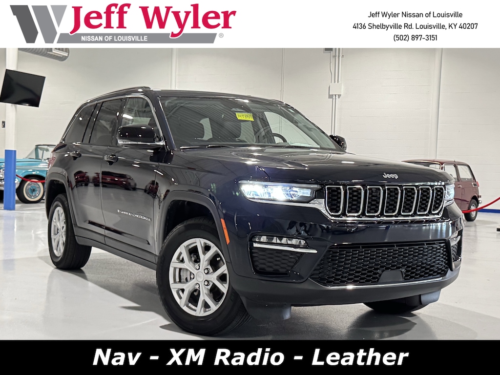 Jeff Wyler Nissan of Louisville is excited to offer this charming 2023 Jeep Grand Cherokee Limited in Midnight Sky. ** HOME DELIVERY OPTIONS! ** Quick Order Package 23E, 3.45 Rear Axle Ratio, 4-Wheel Disc Brakes, 6 Speakers, ABS brakes, Active Noise Control System, Air Conditioning, Alloy wheels, AM/FM radio: SiriusXM with 360L, Anti-whiplash front head restraints, Audio memory, Auto High-beam Headlights, Automatic temperature control, Brake assist, Bumpers: body-color, Capri Leatherette Seats, Compass, Delay-off headlights, Driver door bin, Driver vanity mirror, Dual front impact airbags, Dual front side impact airbags, Electronic Stability Control, Emergency communication system, Four wheel independent suspension, Front anti-roll bar, Front Bucket Seats, Front Center Armrest w/Storage, Front dual zone A/C, Front fog lights, Front reading lights, Fully automatic headlights, Garage door transmitter, Heated door mirrors, Heated front seats, Heated rear seats, Heated steering wheel, Illuminated entry, Knee airbag, Low tire pressure warning, Memory seat, Molded In Color Black/Gloss Black Roof Rails, Navigation System, Normal Duty Suspension, Occupant sensing airbag, Outside temperature display, Overhead airbag, Overhead console, Panic alarm, ParkView Rear Back-Up Camera, Passenger door bin, Passenger vanity mirror, Power door mirrors, Power driver seat, Power Liftgate, Power passenger seat, Power steering, Power windows, Radio data system, Radio: Uconnect 5 Nav w/10.1" Display, Rear anti-roll bar, Rear reading lights, Rear window defroster, Rear window wiper, Remote keyless entry, Security system, Speed control, Speed-Sensitive Wipers, Split folding rear seat, Spoiler, Steering wheel mounted audio controls, Tachometer, Telescoping steering wheel, Tilt steering wheel, Traction control, Trip computer, Turn signal indicator mirrors, Variably intermittent wipers, Voltmeter, and Wheels: 18" x 8" Fully Painted Aluminum Our PRE-OWNED vehicles are put through a rigorous 167- POINT QUALITY ASSURANCE INSPECTION along with an average amount of over $1,400.00 SPENT to recondition each vehicle so we can be sure to deliver you the highest quality vehicle like you deserve! ***ONLINE PRICE DOES NOT INCLUDE WYLER FAMILY FIRST PACKAGE*** Stop by 4136 Shelbyville Road to see for yourself, or give us a call @ 502-897-3151 to schedule your test drive!