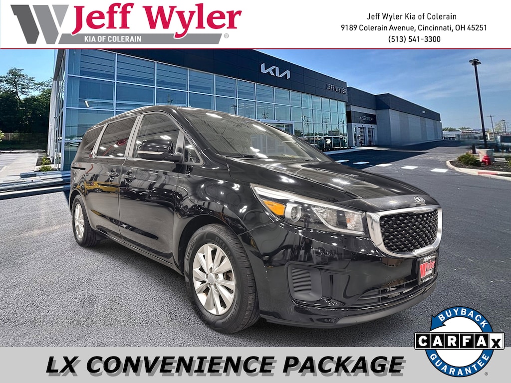 Jeff Wyler Kia of Colerain is proud to offer this charming 2016 Kia Sedona LX in Aurora Black Pearl. LX Convenience Package (Dual Glovebox w/Cooling, Dual Power Sliding Doors, Heated Front Seats, Radio: AM/FM/CD/MP3/SiriusXM Audio System, Rear Park Assist System, Sunshades 2nd & 3rd Row, and UVO eServices), 17" x 6.5J Alloy Wheels, 3.041 Axle Ratio, 3rd row seats: split-bench, 4-Wheel Disc Brakes, 6 Speakers, 8-Passenger Seating, ABS brakes, Air Conditioning, Alloy wheels, AM/FM radio, Bodyside moldings, Brake assist, Bumpers: body-color, Carpeted Floor Mats, CD player, Delay-off headlights, Driver door bin, Driver vanity mirror, Dual front impact airbags, Dual front side impact airbags, Electronic Stability Control, Exterior Parking Camera Rear, Four wheel independent suspension, Front anti-roll bar, Front Bucket Seats, Front Center Armrest, Front reading lights, Fully automatic headlights, Illuminated entry, Low tire pressure warning, Occupant sensing airbag, Overhead airbag, Overhead console, Panic alarm, Passenger door bin, Passenger vanity mirror, Power door mirrors, Power driver seat, Power steering, Power windows, Rear air conditioning, Rear anti-roll bar, Rear reading lights, Rear window defroster, Rear window wiper, Reclining 3rd row seat, Remote keyless entry, Roof rack: rails only, Security system, Speed control, Speed-sensing steering, Split folding rear seat, Spoiler, Steering wheel mounted audio controls, Tachometer, Telescoping steering wheel, Tilt steering wheel, Traction control, Trip computer, Turn signal indicator mirrors, Variably intermittent wipers, and YES Essentials Fabric Anti-Soiling Seat Trim Our PRE-OWNED vehicles are put through a rigorous 167- POINT QUALITY ASSURANCE INSPECTION along with an average amount of over $1,400.00 SPENT to recondition each vehicle so we can be sure to deliver you the highest quality vehicle like you deserve! ***ONLINE PRICE DOES NOT INCLUDE WYLER FAMILY FIRST PACKAGE***