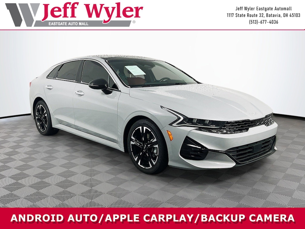 Jeff Wyler Eastgate Auto Mall is pumped up to offer this wonderful 2023 Kia K5 GT-Line in Wolf Gray. Well equipped with: GT-Line Panoramic Sunroof Package (LED Interior Lighting and Panoramic Sunroof), GT-Line Premium Package (Forward Collision Avoidance-Assist, Highway Driving Assist, LED Projection Headlamps, and Smart Cruise Control w/Stop & Go), GT-Line Red Interior Package, 4-Wheel Disc Brakes, 6 Speakers, ABS brakes, Air Conditioning, Alloy wheels, AM/FM radio: SiriusXM, Apple CarPlay & Android Auto, Auto High-beam Headlights, Automatic temperature control, Brake assist, Bumpers: body-color, Carpeted Floor Mats, Cloth/SynTex Seat Trim, Delay-off headlights, Driver door bin, Driver vanity mirror, Dual front impact airbags, Dual front side impact airbags, Electronic Stability Control, Four wheel independent suspension, Front anti-roll bar, Front Bucket Seats, Front Center Armrest, Front dual zone A/C, Front fog lights, Front reading lights, Fully automatic headlights, Heated door mirrors, Illuminated entry, Knee airbag, Low tire pressure warning, Navigation System, Occupant sensing airbag, Outside temperature display, Overhead airbag, Overhead console, Panic alarm, Passenger door bin, Passenger vanity mirror, Power door mirrors, Power driver seat, Power steering, Power windows, Radio data system, Radio: AM/FM/MP3 Audio System, Rear anti-roll bar, Rear seat center armrest, Rear side impact airbag, Rear window defroster, Remote keyless entry, Security system, Speed control, Speed-sensing steering, Split folding rear seat, Spoiler, Sport steering wheel, Steering wheel mounted audio controls, Tachometer, Telescoping steering wheel, Tilt steering wheel, Traction control, Trip computer, Turn signal indicator mirrors, Variably intermittent wipers, and Wheels: 18" Gloss Black Machined Finish Alloy. CARFAX One-Owner. Ask about available certifications. Used vehicles 10 years of age or newer with less than 100,000 miles are eligible for the Wyler Assurance Program, but eligible vehicles must pass our reconditioning process and multi-point inspection. Provided the vehicle passes inspection, vehicles will be eligible for the 6 month/6,000 mile limited warranty. The 6 month/6,000 mile limited warranty is NOT available on AS-IS vehicles, wholesale vehicles, lease buyback/pass-thru vehicles or un-inspected vehicles. Note that this program can also apply to vehicles where the remaining factory coverage is less than 6 months or 6,000 miles. Please check the Federal Trade Commission (FTC) Buyers guide on the vehicle for full details as to whether or not warranty coverage may apply. Contact Dealer for additional details. The Wyler Assurance 6 month/6,000 Mile limited warranty ends 6 months from the date of the Retail Purchase Agreement (BUYERS ORDER) or when the vehicle's odometer registers 6,000 additional miles to the mileage listed on the BUYERS ORDER, whichever comes first. Your Deductible - The warranty holder on your contract pays the first $100 of each covered repair.