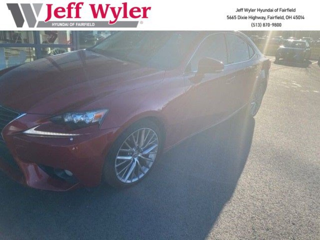 Clean CARFAX. Jeff Wyler Hyundai of Fairfield is excited to offer this handsome 2014 Lexus IS 250 in . Well equipped with: AWD, Android Auto, Apple CarPlay, CALL NOW FOR YOUR VIP APPOINTMENT 513-870-9800, FULLY SERVICED w/RECORDS, GUARANTEED FINANCING!! NO MATTER YOUR SITUATION WE CAN GET AN APPROVAL!!, THE #1 Volume dealer in the region! Come see why for yourself Today!!, WE PAY MORE FOR YOUR TRADE!!, 17" x 7.5" 10-Spoke Aluminum Alloy Wheels, 4-Wheel Disc Brakes, 8 Speakers, ABS brakes, Air Conditioning, Alloy wheels, AM/FM radio: SiriusXM, Auto-dimming Rear-View mirror, Automatic temperature control, Brake assist, Bumpers: body-color, CD player, Compass, Delay-off headlights, Driver door bin, Driver vanity mirror, Dual front impact airbags, Dual front side impact airbags, Electronic Stability Control, Emergency communication system: Safety Connect, Four wheel independent suspension, Front anti-roll bar, Front Bucket Seats, Front Center Armrest, Front dual zone A/C, Front fog lights, Front reading lights, Fully automatic headlights, Garage door transmitter: HomeLink, Heated door mirrors, Heated Front Bucket Seats, Heated front seats, High intensity discharge headlights: Bi-Xenon, Illuminated entry, Knee airbag, Lexus Premium Audio System, Low tire pressure warning, NuLuxe Seat Trim, Occupant sensing airbag, Outside temperature display, Overhead airbag, Overhead console, Panic alarm, Passenger door bin, Passenger vanity mirror, Power door mirrors, Power driver seat, Power moonroof, Power passenger seat, Power steering, Power windows, Radio data system, Rear anti-roll bar, Rear reading lights, Rear seat center armrest, Rear side impact airbag, Rear window defroster, Remote keyless entry, Security system, Speed control, Speed-sensing steering, Speed-Sensitive Wipers, Split folding rear seat, Steering wheel mounted audio controls, Tachometer, Telescoping steering wheel, Tilt steering wheel, Traction control, Trip computer, Turn signal indicator mirrors, and Variably intermittent wipers. Reviews: * Opting for the most visually appealing vehicle in a particular segment can sometimes mean settling for less when it comes to long-term reliability and value. Not so with the 2014 Lexus IS, as it blends eye-catching style and luxurious interior treatments with one of the most enjoyable ownership experiences in the industry. Source: KBB.com * Upscale and well-built interior; communicative steering; smooth ride. Source: EdmundsTO CHECK ON THE AVAILABILITY OF THIS VEHICLE REACH OUT TO ONE OF OUR TEAM MEMBERS!! ALSO SHOP ONLINE AT https://www.jeffwylerhyundaioffairfield.com/ Proudly Serving: Cincinnati, Dayton, Columbus, Louisville, Lexington, Indianapolis, Hamilton, Florence, Alexandria, Beavercreek, Springdale, West Chester, Monroe, Fairfield, Kenwood, Newport and all of greater Cincinnati Ohio, Indiana, and Northern Kentucky.