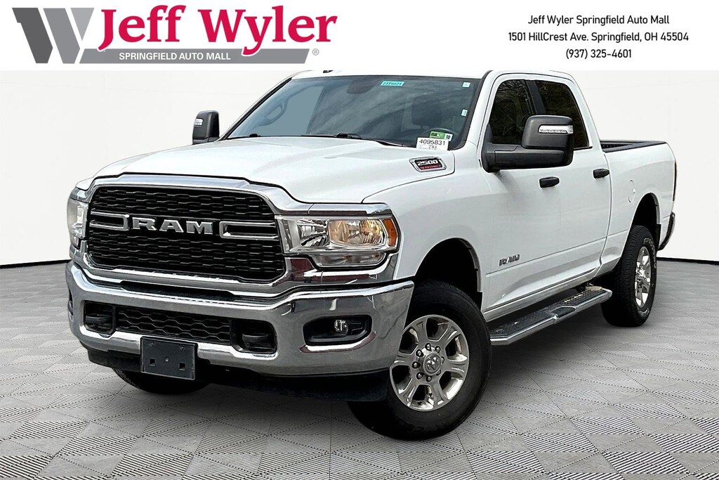 Jeff Wyler Springfield Auto Mall is excited to offer this beautiful-looking 2024 Ram 2500 Big Horn in Bright White Clearcoat. Well equipped with: Level 1 Equipment Group (2 Way Rear Headrest Seat, 2nd Row In Floor Storage Bins, 4 Way Front Headrests, 40/20/40 Split Bench Seat, 4G LTE Wi-Fi Hot Spot, 8.4" Touchscreen Display, Apple CarPlay, Auto Power-Folding Mirrors, Big Horn IP Badge, Black Exterior Mirrors, Bluetooth Handsfree Phone & Audio, Center Hub, Connectivity - US/Canada, Dual Glove Boxes, Exterior Mirrors Courtesy Lamps, Exterior Mirrors w/Heating Element, Exterior Mirrors w/Supplemental Signals, Foam Bottle Insert (Door Trim Panel), Footwell Courtesy Lamp, For Details, Visit DriveUconnect.com, For More Info, Call 800-643-2112, Forward & Reverse Utility Lights, Front Armrest w/Cupholders, Front Center Seat Cushion Storage, Front Fog Lamps, Front Seat Back Map Pockets, Global Telematics Box Module (TBM), Glove Box Lamp, Google Android Auto, GPS Antenna Input, Integrated Center Stack Radio, Integrated Voice Command w/Bluetooth, Leather Wrapped Steering Wheel, Locking Lower Glove Box, Manual Adjust 4-Way Front Passenger Seat, Mirror Running Lights, Power 2-Way Driver Lumbar Adjust, Power Adjust 8-Way Driver Seat, Power Adjust Mirrors, Power Adjustable Convex Aux Mirrors, Power Heated Fold Telescope Mirrors, Power Telescoping Mirrors, Rear 60/40 Folding Seat, Rear Dome w/On/Off Switch Lamp, Remote USB Port - Charge Only, Selectable Tire Fill Alert, SiriusXM Radio Service, SiriusXM Satellite Radio, Steering Wheel Mounted Audio Controls, Storage Tray, and Wheels: 18" x 8.0" Polished Aluminum), Quick Order Package 2GZ Big Horn, 3.73 Axle Ratio, 4-Wheel Disc Brakes, 6 Speakers, ABS brakes, Active Noise Control System, Air Conditioning, Brake assist, Bumpers: chrome, Center Stack Storage Drawer, Chrome Flat Cab-Length Side Steps, Cloth 40/20/40 Bench Seat, Compass, Delay-off headlights, Driver door bin, Dual front impact airbags, Dual front side impact airbags, Electronic Stability Control, Electronically Controlled Throttle, Emergency communication system: SiriusXM Guardian, Front anti-roll bar, Front Center Armrest w/Storage, Front License Plate Bracket, Front reading lights, Fully automatic headlights, Heated door mirrors, Illuminated entry, Low tire pressure warning, Manual Adjust 4-Way Driver Seat, Manufacturer's Statement of Origin, Occupant sensing airbag, Outside temperature display, Overhead airbag, Overhead console, Panic alarm, ParkView Rear Back-Up Camera, Passenger door bin, Passenger vanity mirror, Power door mirrors, Power steering, Power windows, Premium Cloth 40/20/40 Bench Seat (DISC), Radio data system, Radio: Uconnect 3 w/5" Display, Radio: Uconnect 5 W w/8.4" Display, Rear anti-roll bar, Rear Folding Seat, Rear seat center armrest, Rear step bumper, Remote keyless entry, Speed control, Tachometer, Tilt steering wheel, Tip Start, Tow Hooks, Traction control, Trip computer, Turn signal indicator mirrors, Variably intermittent wipers, Voltmeter, and Wheels: 18" x 8.0" Steel Chrome ClaD. Ask about available certifications. Used vehicles 10 years of age or newer with less than 100,000 miles are eligible for the Wyler Assurance Program, but eligible vehicles must pass our reconditioning process and multi-point inspection. Provided the vehicle passes inspection, vehicles will be eligible for the 6 month/6,000 mile limited warranty. The 6 month/6,000 mile limited warranty is NOT available on AS-IS vehicles, wholesale vehicles, lease buyback/pass-thru vehicles or un-inspected vehicles. Note that this program can also apply to vehicles where the remaining factory coverage is less than 6 months or 6,000 miles. Please check the Federal Trade Commission (FTC) Buyers guide on the vehicle for full details as to whether or not warranty coverage may apply. Contact Dealer for additional details. The Wyler Assurance 6 month/6,000 Mile limited warranty ends 6 months from the date of the Retail Purchase Agreement (BUYERS ORDE